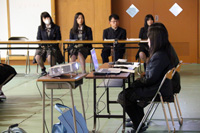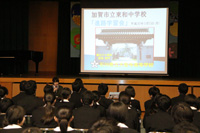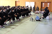 2年生は、ちょうど1年後に公立高校を受験することになります。このタイミングで受験生の意識を持ってほしいとの願いから、進路学習会を行いました。説明には、本校の卒業生で、大聖寺実業高校、加賀高校、大聖寺高校に通っている2年生を2名ずつ招き、それぞれの高校の特徴を話してもらいました。各高校とも、パソコンを使ったプレゼンやビデオを使った説明で、とても興味を引き、わかりやすい説明でした。パンフレットでは書かれていない、高校生の生の感想が伝わってきました。中学生からは、高校生活やロボレーブなどの質問もでました。中学生は、早く受験生という意識をもち、継続した勉強を積み上げてほしいと願います。
