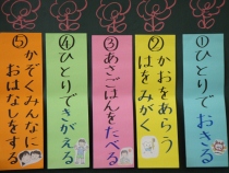 1年生になったら、自分で出来ることは自分でするようにします。今日はどうだったかな?みんな、しっかりと出来たようです?