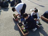 緑の少年団の5・6年生に、玄関のプランターにパンジーとチューリップを植えてもらいました。
