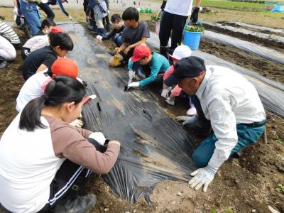2024.5.30.【ボランティアさんに教えていただきながら、全校でさつまいもの苗植えを行いました!】