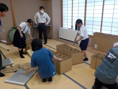 自分たちの住んでいる地域のハザードマップを確認したり、避難場所を確認したりした後、実際に避難所を設営する体験もしました。