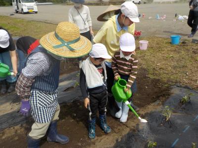 地域のボランティアさん3名に、苗の植え方や水のやり方を教えていただき、上手に植えることができました。