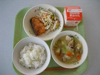 今日の給食は、セルフおにぎり、鮭の塩焼き、つけもの、いも煮、のりでした。毎年1月24日から30日までは全国学校給食週間です。今日は、日本で最初に始まった給食を再現したものです。ごはんには塩味がついています。今日もおいしくいただきました。