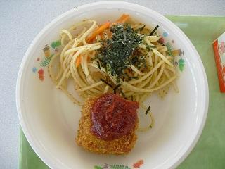 今日の給食は「おはなしからとびだしたりょうり」でした。ふかざわゆみこさん(絵・作)の「ぎょうれつのできるレストラン」に登場するメニューで、コッペパン、いちごジャム、レストラン特製トマトスパゲティ、野菜スープ、かんたんスィートポテトでした。調理員さんがつくる愛情いっぱいの料理、どれもとてもおいしかったです。