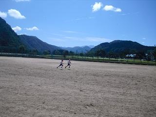 2年生の体育。きれいな景色に囲まれて気持ちよく走ったり、体操をしたりしていました。