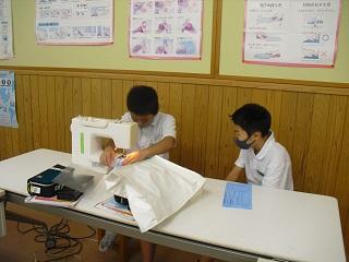 6年生の家庭。これからリュックや手提げなど自分が選んだものを製作していきます。今日はミシンの練習をしていました。