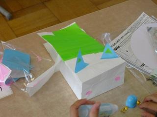 1年生の図工。紙袋の一部を切ってロケットや動物などをつくり、うちわで風を送って動かします。
