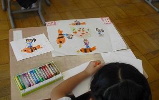2年生の図工。絵の具のどの色を組み合わせて何を表現するか考えていました。
