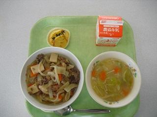 今日の給食は、牛丼、みそ汁、かぼちゃのカップケーキでした。カップケーキも調理員さんの手作りで、とてもおいしかったです。