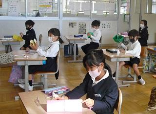 下校時に家庭学習用のプリントを持ち帰る児童の様子です。