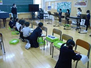 1年生の音楽。姿勢正しく話を聞いているところです。
