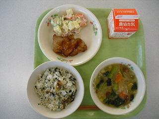 今日の給食は、鉄骨ごはん、豚肉のくわ焼き、ポテトサラダ、大根と油揚げのみそ汁でした。骨を強くする鉄分とカルシウムが多いわかめとあさりがたっぷり入っているので、鉄骨ごはんといいます。とてもおいしかったです。