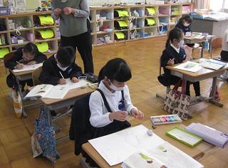 1年生は国語の授業で、知らせたいものの絵と見つけたことを書くという学習をしています。今日は絵を描いて、絵から線を引いて見つけたことを短い言葉で書いていました。