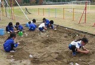 たてわり班でサツマイモを掘りました。大きなサツマイモがたくさん収穫できました。