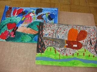 2年生は「かわにくまがおっこちた」という本を読んでの感想画を描いていました。くまだけでなくカエル、カメ、ビーバー、アライグマなどたくさん動物が出てきます。