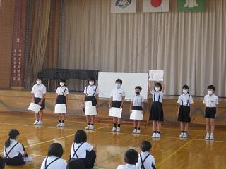 鳥越っ子集会の様子です。各委員会から全校児童に先日の委員会で決まったことやお知らせしたいことを伝えました。今日の集会のめあては、話す方は「相手に伝わる声ではっきり堂々と言うこと」、聞く方は「自分がしなければいけないことを聞き取ること」でした。話す方も聞く方もめあてを意識した素敵な集会でした。しなければいけないことがわかったら、あとは実行することが大切ですね。頑張りましょう。