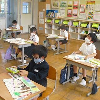 5年生は、読書感想画に取り組んでいます。「よだかの星」(宮沢賢治)を読んで、感じたことや思ったことを絵で表現していました。