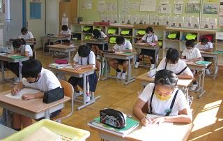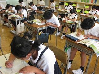 6年生。書写ではどの子も丁寧にきれいな字で書いていました。算数の問題にも意欲的に取り組んでいました。