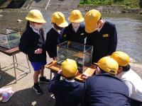 太陽の下、元気いっぱいのあゆを元気いっぱいの鳥越っ子が放流しました。