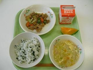 今日の給食は、わかめごはん、ホイコーロー、トマトと卵のスープ、メロンでした。スープにはトマトが入っていてさっぱりとした味でおいしかったです。メロンはとても甘かったです。