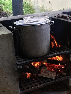 野外炊飯をしています。巻ををくべて火を起こし