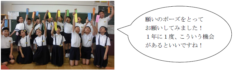 短冊に願い事を書きました。6年生が大きな笹を持ってきてくれたので、そこに付けさせてもらいました。願い事は「~~になりますように」という書き方ではなく、「~~になります」と言い切った方がよいそうで、そのように書いてみました。