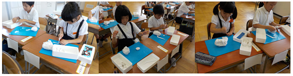 学校へ戻ってから作業工程をおさらいし、普通の紙(「和紙」に対し「洋紙」と言います。前日に学習しておきました)との作り方の共通点や相違点を考えました。「水をたくさん使うところが同じ」「熱して繊維を取り出すところが同じ」「網の上に広げて水気を取る所が同じ」などたくさんの気づきがありました。