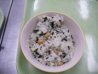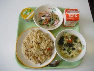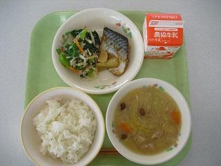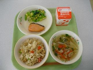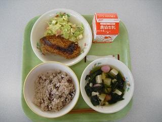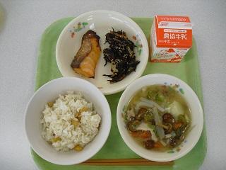 今日、11月24日は「和食の日」です。今日は和食の日にあわせたメニューでした。大豆ごはん、鮭の塩こうじ焼き、ひじきとれんこんのいり煮、めった汁でした。まめ、ごま、わかめ(海藻)、やさい、さかな、しいたけ(きのこ)、いもの「まごわやさしい」食材が使われています。今日もおいしくいただきました。