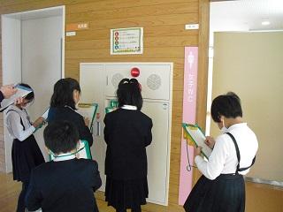 3年生の社会では、くらしを守る仕事について学習しています。今日は消防の仕事に関わって、学校内の消火器や防火シャッター、防火扉などを調べていました。