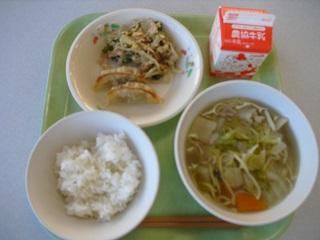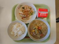 今日の給食は、焼きギョウザ、大根のピリからあえ、みそラーメンでした。今日もおいしくいただきました。