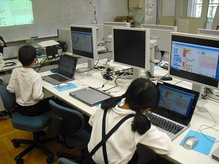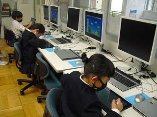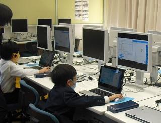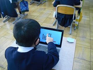 1年生の音楽の授業。今日はICTサポーターの先生の来校日なので、パソコンでリズムをつくる学習をしていました。