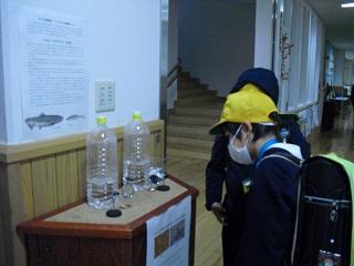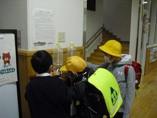 昼休みに、6年生が「卵から半分からだが出ています。」と教えてくれました。みんな興味津々でみています。ふかしてから20日~30日は、お腹の袋の中の栄養分で生きることができます。