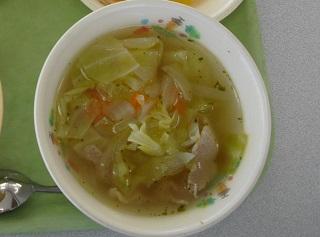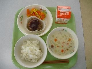 今日の給食は、ミートローフ、にんじんグラッセ、クラムチャウダーでした。ミートローフには、チーズやにんじん、枝豆などがたくさん入っていて、とてもおいしかったです。