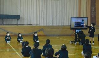 あられも降り、とても寒い日が続いています。風邪などひかないように十分気をつけましょう。今日は2年生と3年生が白山警察署の方にお越しいただき、「ピュアキッズスクール」を行いました。してはいけないことなど、社会のルールについて考え、学びました。