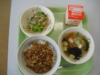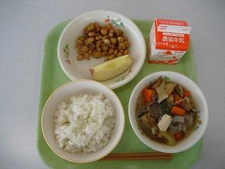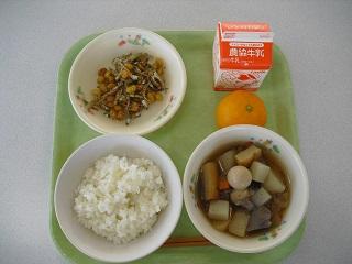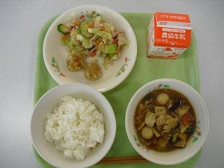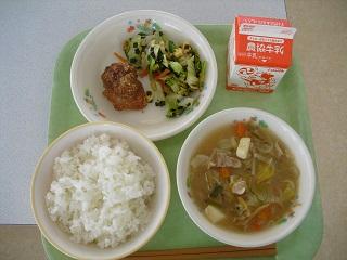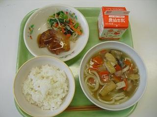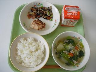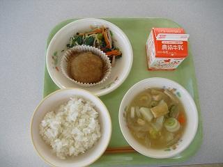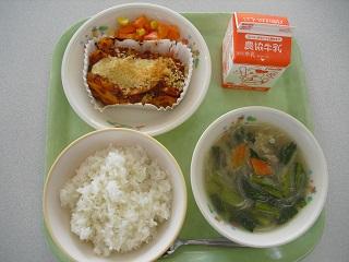 今日の給食は、鶏肉の竜田揚げ、きんぴらごぼう、豆腐と卵のみそ汁でした。みそ汁の中に入っていた「ふかし」もとてもおいしかったです。