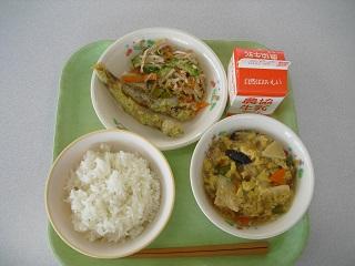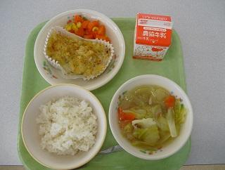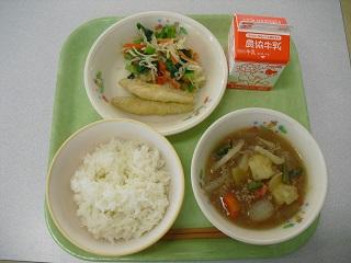 今日の給食は、魚のいしがきフライ、ブロッコリーのおかか和え、めった汁でした。今日もおいしくいただきました。