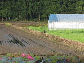 苗を3本ずつ、十字の印の所に、きをつけの姿勢で