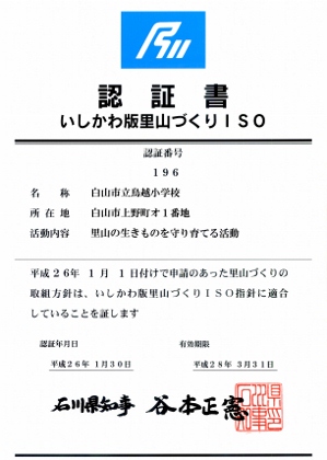 石川県が推進している「いしかわ版里山づくりISO」の取り組みに対して鳥越小学校が認証を受けることになりました。認証書交付式へは学校長が出席し、知事より認証書いただきました。