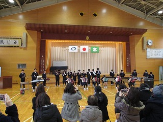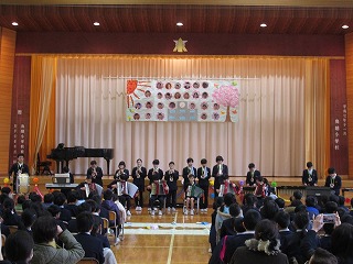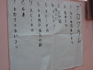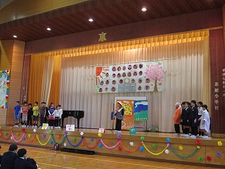 全校合唱は「にじいろ」 六年生を送る会バージョンで