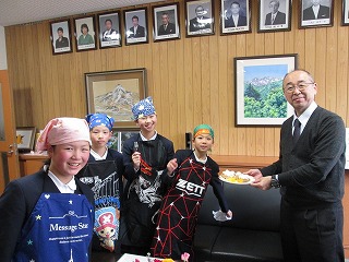 プレゼントのメダルを胸に掛け、お礼の気持ちを込めて