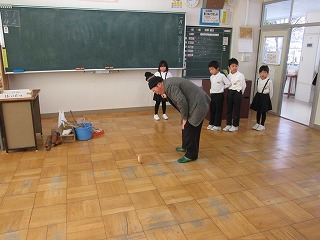 ビシごま(手作り)の先生が来校し、遊びを教えるための