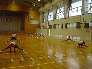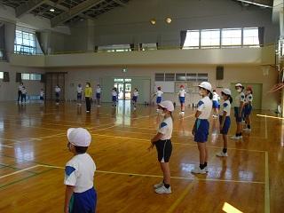 1年生の体育。ラジオ体操や昨日教わった踊りの練習をしていました。