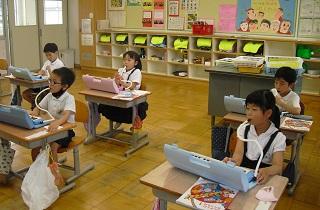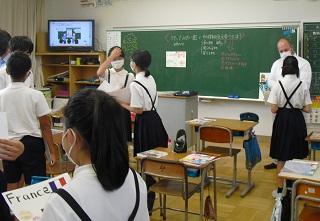 4年生の外国語活動。文房具の言い方について学習していました。ALTの先生が英語で言った文房具を聞き取って上にあげています。