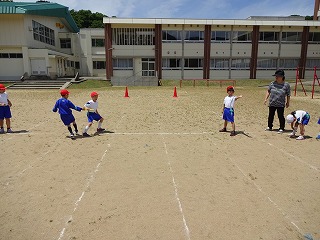 児童は、4チームに分かれ折り返しリレーをしました。