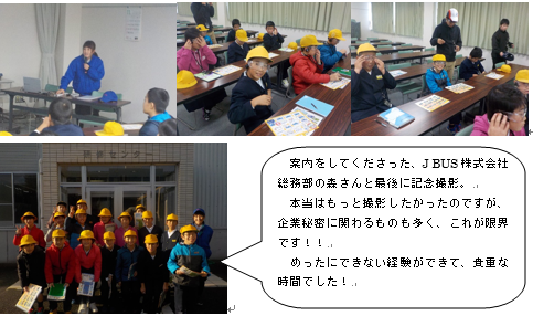 11月29日、社会科の工業の学習に合わせ、小松の「J BUS株式会社」の工場見学に行ってきました。社会で学習した乗用車とは大きく違い、多くの工程で手づくりをしていたり、日当たり生産台数が約10台であったりと、驚かされることばかりでした。