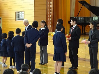 代表の児童が、御礼の言葉をかけ、花束をお渡ししました。