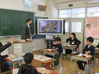 6年生の外国語の授業です。担任とALTのコルビー先生が授業をします。廊下には図工の作品が掲示されています。