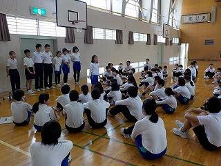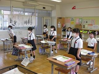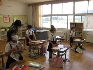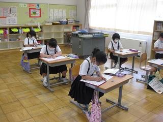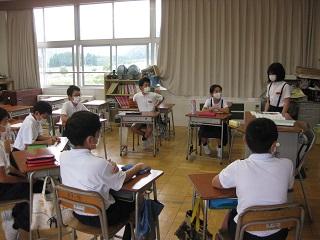 3・4・5・6年生の授業の様子です。どの学年も真剣に学習に取り組んでいました。3・4年生は算数の授業をしているところです。5年生は国語の授業で廊下で間隔をとって音読の練習をし、そのあと先生に聞いてもらっていました。とても表現力豊かに読んでいて感心しました。6年生は体育の授業をしていました。体育の授業ではマスクをはずすため、密接しないようにしています。