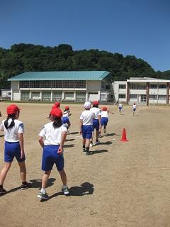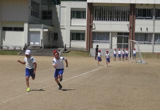 4年生は、体育でダッシュや50m走をしていました。体を徐々に慣らしながら、走っています。
