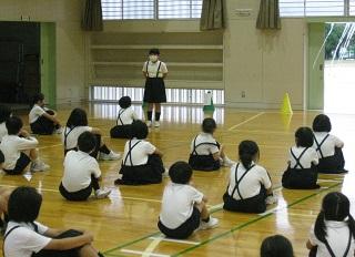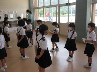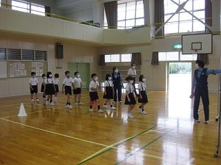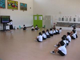 1年生の体育と生活の授業。体育では先生と同じポーズを素早くとっています。